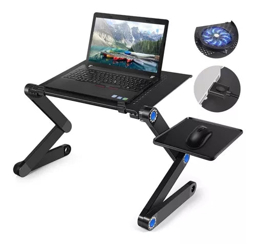 MESA REFRIGERANTE MULTIFUNCIONAL PLEGABLE T8 Muy versátil: este soporte de escritorio ajustable para portátil no solo se puede utilizar como un soporte para portátil, sino que también funciona como un escritorio de pie, soporte para Tablet, escritorio de regazo que se puede utilizar en la cama o sofá. Solo tienes que ajustar las piernas a varias posiciones para satisfacer tus necesidades. Fácilmente ajustable: este soporte para portátil es muy fácil de ajustar. Solo tienes que pulsar el botón en el lateral del soporte, ajustar el ángulo y luego soltar el botón a una posición fija. Las patas se pueden ajustar a diferentes posiciones para adaptarse a tus necesidades2 ventiladores de refrigeración de CPU: estos ventiladores de CPU ultra silenciosos se alimentan a través de puertos USB para aspirar el aire caliente de tu portátil para una disipación activa del calor. No hay necesidad de preocuparse por el sobrecalentamiento de tu portátil. Si tu portátil es MacBook, necesitas utilizar el cable USB tipo C. (Modelo: HNC2U)Diseño duradero: construido con una bandeja de aluminio ligera y altamente reforzada con 2 hebillas antideslizantes y 6 resistentes articulaciones ajustables de ABS Auto bloqueo (el ABS es una mezcla de polímero de dos fases, termoplástico más duro y duradero) que hacen que sea fácil de transportar y sostener tu computadora firmemente sin deslizamiento Ajustable a 360 grados: Diseño ergonómico, cada pata plegable tiene 3 pomos que se pueden ajustar en cualquier altura y ángulo que desees. Después de plegarlo, el soporte es bastante pequeño y se puede guardar cuando no esté en uso. Especificaciones: Peso del producto: 3.5 lb Tamaño: 20.1 x 10.2 x 1.6 in. Peso del rodamiento: 33lbMaterial del producto: aluminio + plástico. Altura máxima ajustable: 18.9 pulgadas.