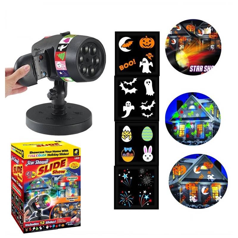 La forma más brillante y bella de iluminar tu casa en la epoca mas linda del año. La configuración es fácil. Ubicas el dispositivo a la distancia que enfoque la fachada de la casa, elige la diapositiva que quieras usar, insértala en la unidad y comenzara a proyectarse. La presentación de las diapositivas viene en tres velocidades: lenta, rápida y de congelación. Esta dotada con un motor eficiente y luces LED brillantes Cubre hasta 290 metros cuadrados de la parte exterior de su hogar. Tambien puedes crear interiores festivos, perfectos para apartamentos, sótanos, salas recreativas o en cualquier lugar que quieras celebrar ya que incluye una base interior que te permite fijar el proyector en el interior del hogar.*Carcasa resistente al agua*6 diapositivas de motivos diferentes*3 velocidades: lentoa, rápida y congelada*Base interior para usar el proyector dentro de la casa*Seguro para la lluvia*Cubre hasta 290 metros cuadrados*luces brillantes LED*Incluye Estaca extralarga